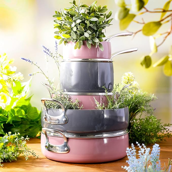 Bloomhouse 12 Piece Aluminum Pots and Pans Cookware Set w/Non-toxic Ceramic Non-stick, Ceramic Steamer Insert, & 12 Protective Care Bags - Pink Orchid