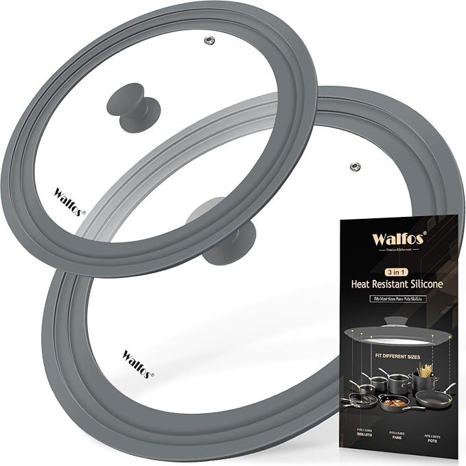 • 【Safety Food Grade Material】Walfos pan lid is made of premium tempered glass and food grade silicone, BPA Free. The Glass lid helps you to say goodbye to metal rusting and the 450°F heat resistant silicone lid with non-slip silicone knob saves you from getting burning. Safe for microwave and dishwasher.
