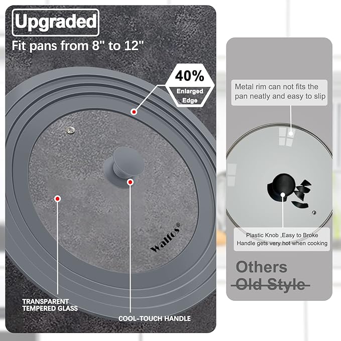 • 【Safety Food Grade Material】Walfos pan lid is made of premium tempered glass and food grade silicone, BPA Free. The Glass lid helps you to say goodbye to metal rusting and the 450°F heat resistant silicone lid with non-slip silicone knob saves you from getting burning. Safe for microwave and dishwasher.