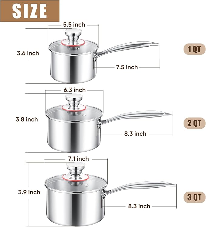 • SET OF 3 - This set includes 3 saucepans with 1QT, 2QT and 3QT capacities, Can be used to boil water, cook and reduce sauces, make rice and oatmeal, warm milk, reheat leftovers, Great for stewing, simmering, making soups, poaching eggs and “whisk jobs”, Ideal gift for Christmas, Thanksgiving Day, housewarming and other special occasions