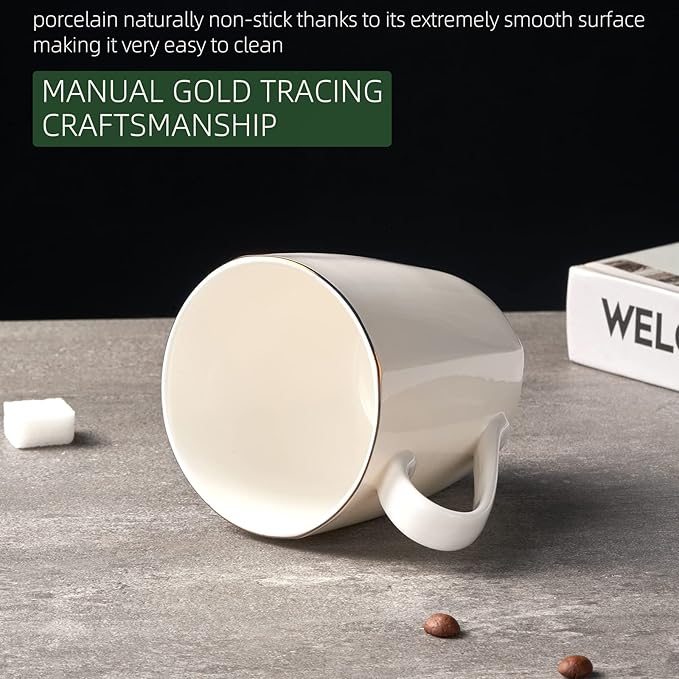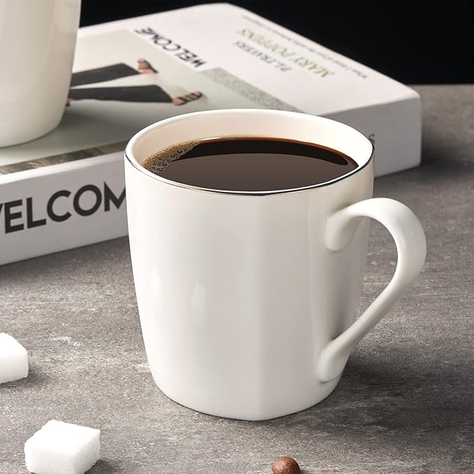 Bone China Coffee Mugs, 10oz Espresso Cups, Lightweight Porcelain White Coffee Mugs, Ceramic Tea Cups with Gold Trim Set of 6, Microwave safe(Moonliaght)