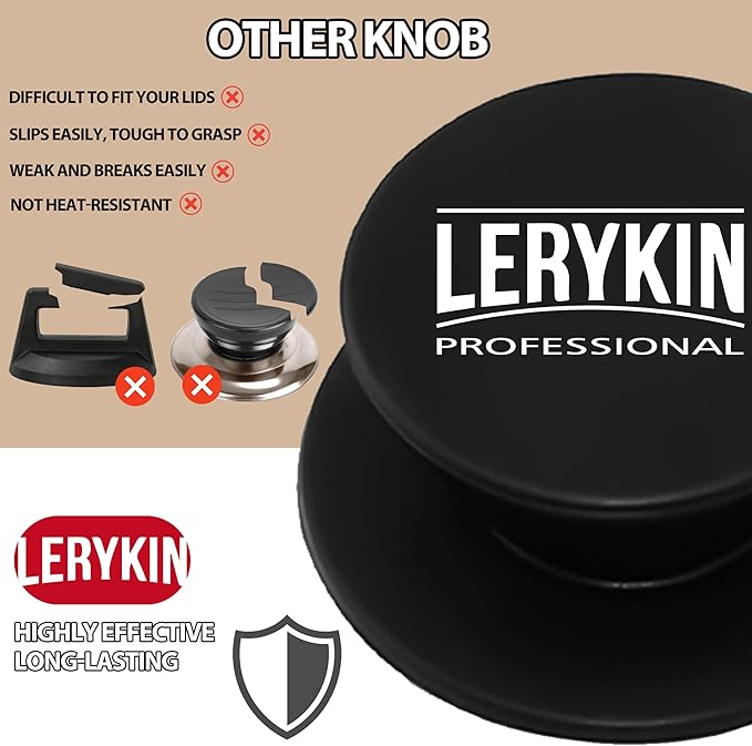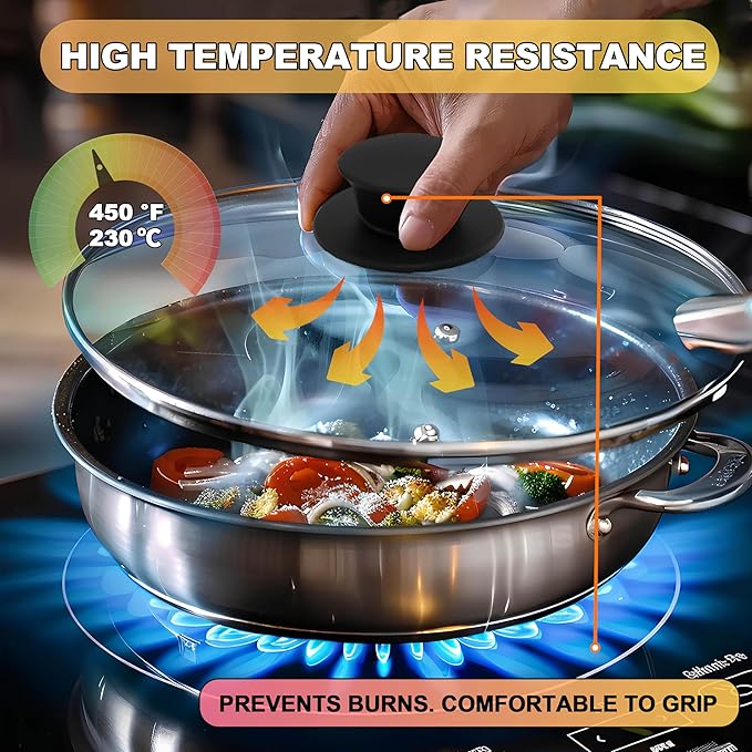 • 【 PREMIUM QUALITY SILICONE 】: Lerykin silicone pot lid knob is crafted from high-quality food-grade silicone, ensuring safety, durability, and long-lasting performance. It is designed to withstand high temperatures without deforming or cracking, providing a reliable and safe option for your kitchen.