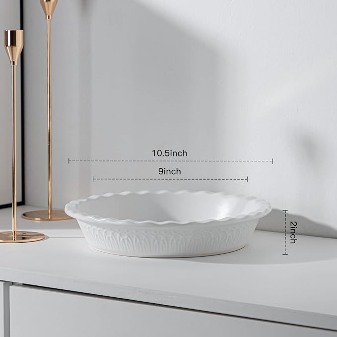 • Ruffled Edge Pie Plate: 10.5 inch in upper diameter, 2 inch in height, it fits any standard pie recipe. Whether you’re making an apple pie or Lorraine, the fluted rim makes it easy to crimp down the pie dough for a lovely crust. The fluted rims are aesthetics and easy griping.