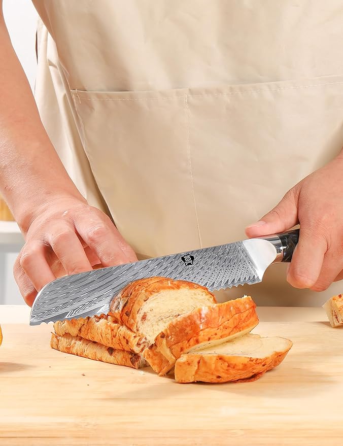 • 【8 inches Serrated Bread Knife】 WILDMOK bread knife is made of high quality 67-layer Damascus steel, which resists rust, corrosion and discoloration and is free from chemical reaction, preserving the original taste, freshness and nutritional value of the food. This bread slicer cuts effortlessly through thick bread. No crumbs, cuts quickly without tearing.