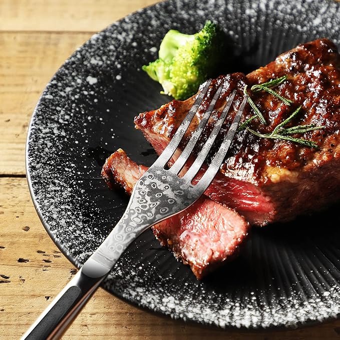 • A Beautiful Addition to Your Dining Table - Crafted from the finest Damascus steel, the steak knife set will elevate your dining experience. The mesmerizing Damascus pattern transforms each steak knife into a work of art, the luxurious appearance will surely impress your guests.