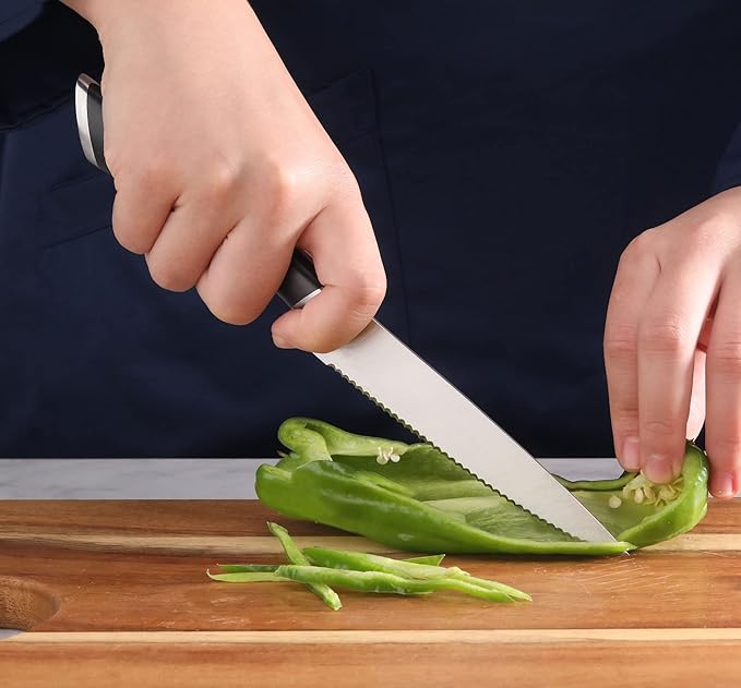 • The 5-inch Serrated Utility Knife is an everyday essential, designed to cleanly slice anything from bagels and crusty breads to cured meats or tough-skinned fruits and vegetables. The serrations pierce the exterior of the food and slice through with very little pressure needed, preventing your cut from crushing even the most delicate foods like fresh, ripe tomatoes.