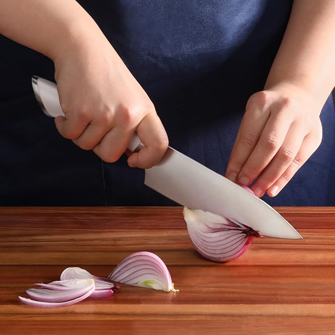 • Handcrafted full-tang knives forged from tight-grained X50CrMoV15 German Steel for incredible durability, stain resistance, and exceptional edge retention.