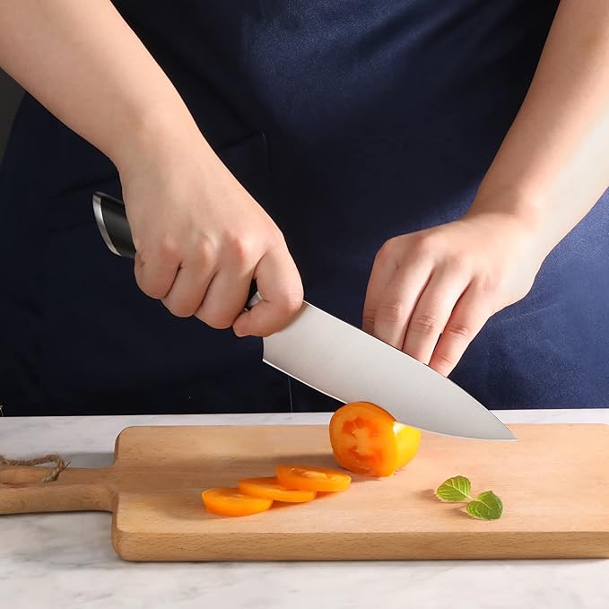 • Handcrafted full-tang knives forged from tight-grained X50CrMoV15 German Steel for incredible durability, stain resistance, and exceptional edge retention.
