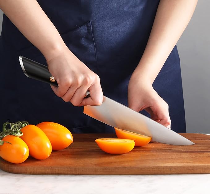 • Handcrafted full-tang knives forged from tight-grained X50CrMoV15 German Steel for incredible durability, stain resistance, and exceptional edge retention.