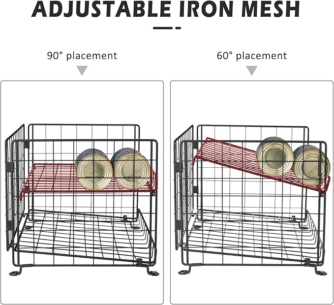 • 【STURDY AND DURABLE】Our can storage organizer is made of strong iron material, the iron wires on the peripheral edges are thickened, and divider mesh is fixed with screws for sturdiness and durability. Can holders for pantry can withstand the heavy cans and not easy to bend and collapse.