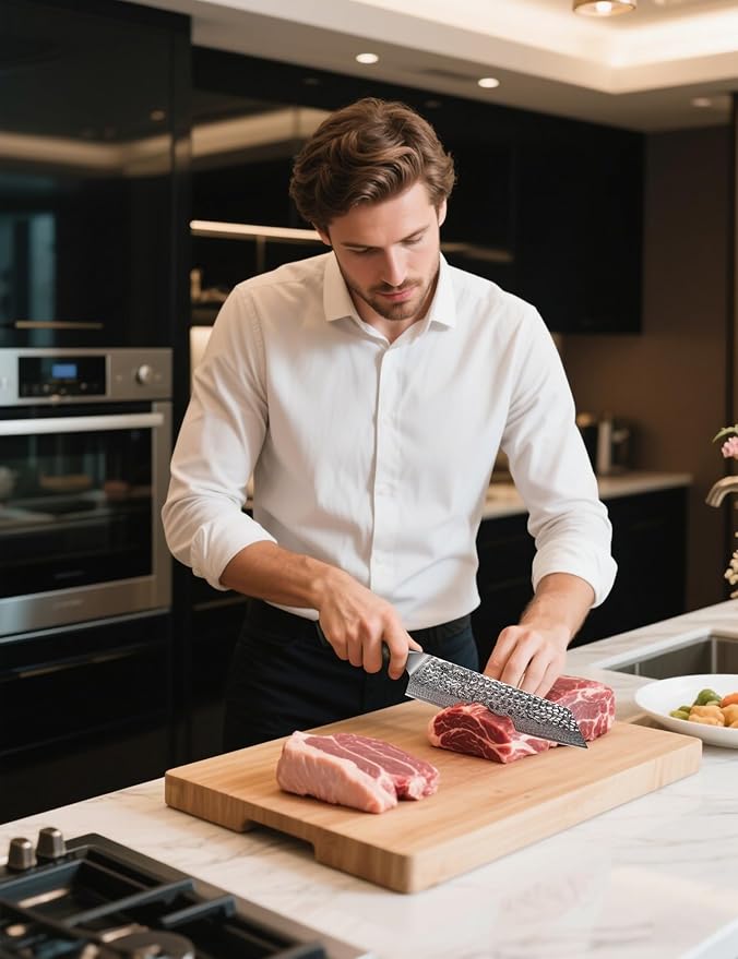 • Premium Blade: This is a Japanese kiritsuke knife type, which is made of 67 layers of Damascus steel, the core layer is VG10 material, wrapped by 33 layers of high-quality high-carbon stainless steel layers on each side to ensure excellent strength, toughness and durability. The slender blade design achieves high-precision cutting, and the forged surface is polished to minimize drag for jelly-smooth cuts and enhanced non-stick performance