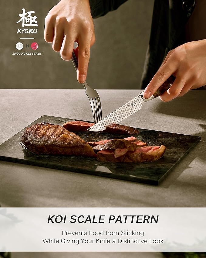 • Non-Stick Koi Scale Pattern: This steak knife set features an eye-catching koi scale pattern that not only adds to its visual charm but also makes slicing and dicing easy by preventing food from sticking
