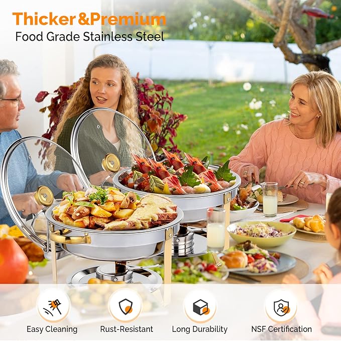 • 【UPGRADE STAINLESS STEEL & EASY CLEANING】Made of 2mm thick food grade stainless steel all the items are tested to ensure safety and longevity, we can guarantee that you will receive safe and well built chafing dishes. And it is convenient for you to clean every corner of both the inner with dish washing liquid and dried with a soft towel. The food pan, water pan and cover are dishwasher safe.