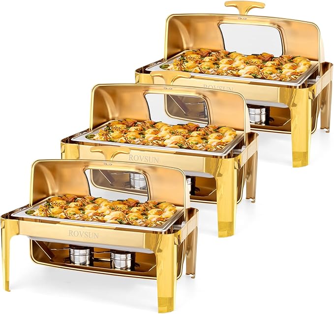ROVSUN 9QT 3 Pack Roll Top Chafing Dish Buffet Set, Rectangular NSF Stainless Steel Buffet Warmer Chafers with Thick Frame for Catering Events Parties Weddings Dinners, Gold