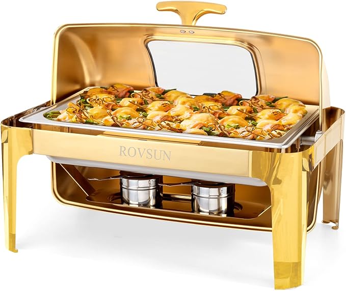 ROVSUN 9QT Roll Top Chafing Dish Buffet Set,Rectangular NSF Stainless Steel Buffet Warmer Chafers and Buffet Warmers Sets with Thick Frame for Catering Events Parties Weddings Dinners,Gold
