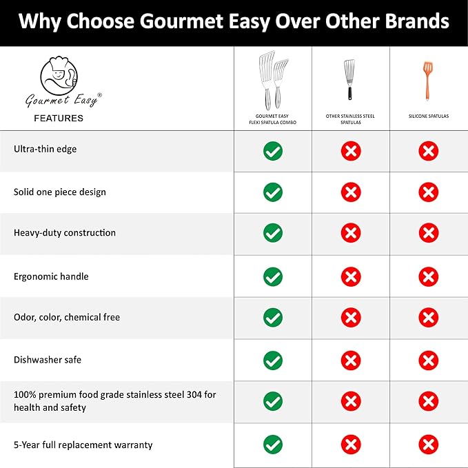 • ERGONOMIC HANDLE – ULTIMATE CONTROL - This stainless steel spatula set features an ergonomic, non-slip handle for a firm grip, even with wet hands. Whether you're flipping eggs or sautéing, it offers all time comfort and control.