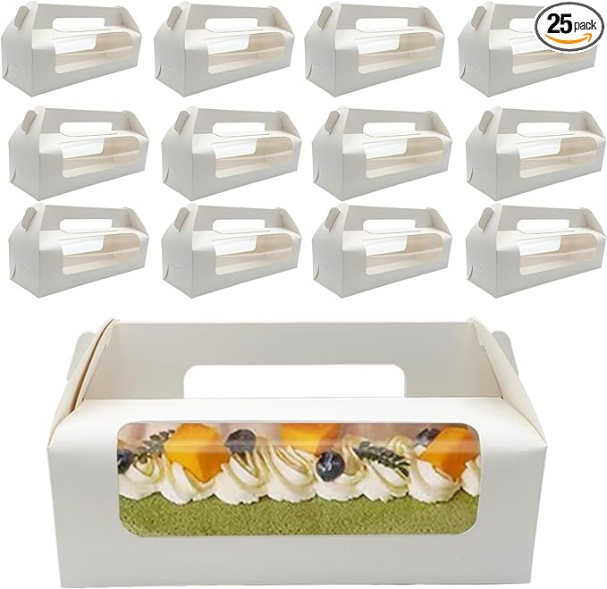 25 Pcs 10.5 Inch Window Roll Cake Gable Boxes Bulk with Handle & Cake Boards, Homemade & Bakery White Paper Favor Containers, Easy Carrying, Gift Boxes for Christmas Wedding