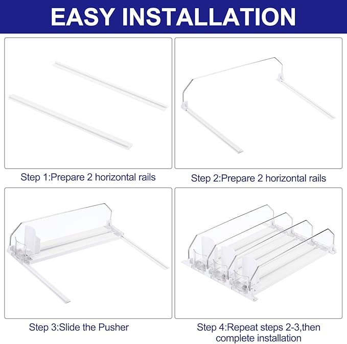 • Easy to Assemble And Clean - This refrigerator beverage dispenser is easy to assemble, no need to use any screws or tools, you can install it by hand within minutes. Just need to push back on the spring and insert the cans. Besides, its smooth surface and waterproof material make fridge drink rack easy to clean as well.