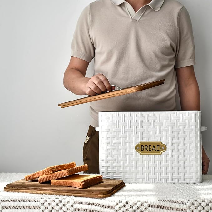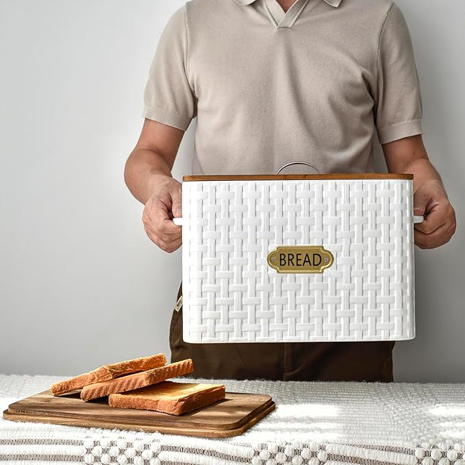 Extra Large Space Saving Farmhouse Bread Box With Wood Lid - Vertical Breadbox Bread Storage Bin Holder for Kitchen Countertop, White
