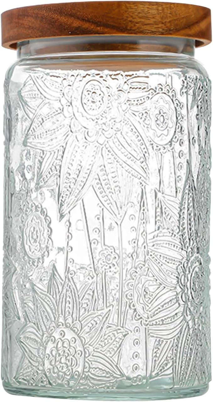 • 【VINTAGE GLASS JAR】Sunflower, begonia, window patterns and random wood grain lid of retro storage jar create a retro and unique decorative effect, transparent glass makes it easy to check the status and amount of food left over, practical and can decorate kitchen counter pantry and living room.
