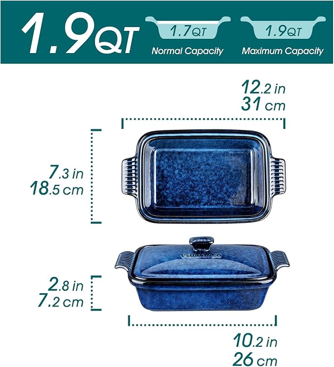 • 【AMPLE CAPACITY】 With dimensions of 12.2* 2.8 inchs and a generous 1.9-quart capacity, this ceramic square baking dish is perfectly suited to meet the cooking needs of a family of 3-5 people.