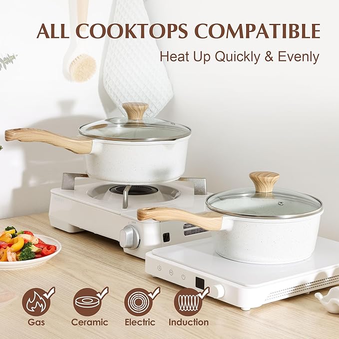 • Suitable For All Stoves - High magnetic conductive stainless steel base allows the 1.5 qt saucepan with lid nonstick to work on all cooktops, including induction. The core of small sauce pan is made of cast aluminum, which is sturdy, long-lasting and heats up quickly and evenly.