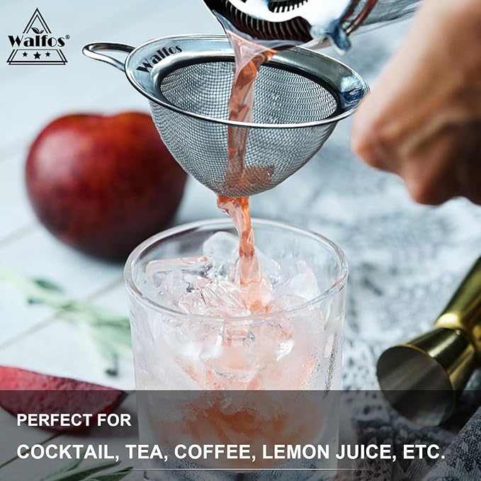 • MULTIPLE-USE SIEVE: WALFOS mesh strainers for kitchen are great for sifting flour, powdered sugar, matcha powder, cocoa powder, spices; straining loose leaf tea, fruit juice, cocktail, pasta noodles, gravy, and rinsing quinoa, rice, grains, vegetables, fruits, beans, etc.. A must have to sifting and straining wet or dry ingredients