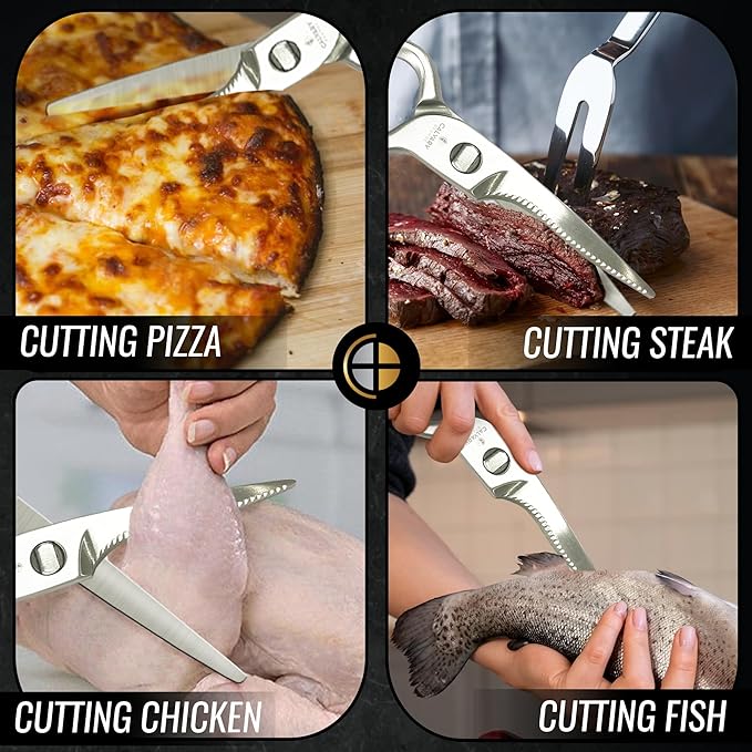 - MAKES A GREAT GIFT - The perfect shears for working with poultry, meat, and other foods while preparing meals and cooking during the summer grilling season! Get a pair for your father for Father's Day. Surprise your loved ones with the luxurious gift of our heavy duty kitchen scissors, a perfect choice for any occasion. These stainless steel marvels are not only functional but also elegant, making food preparation a delightful experience.