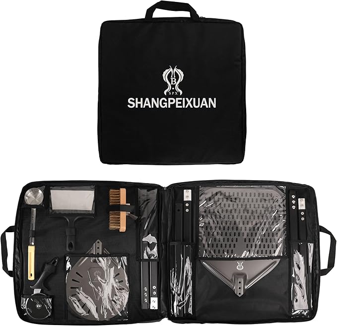 • Ideal for light-duty use in your foodservice establishment, this kit includes a 12'' x 14"aluminum rectangular pizza peel, an 9" aluminum round Turning pizza peel, a 32" adjustable swivel brass bristle brush, and a 3.7inch pizza cutter,a 6.4inch food knife,a 3oz Sauce spoon.