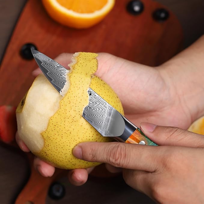 • 【Damascus steel Paring Knife】 Manufactured with ultra-premium stainless 67-layered Damascus steel, this 3.5 in. fruit knife boasts unrivaled performance and incredible edge retention; the cobalt added steel outperforms VG10 steel in usability and is easier to sharpen, since cobalt enhances the other alloying elements.