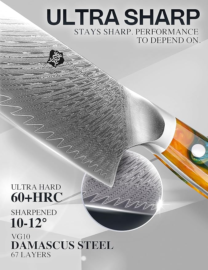 • 【Professional Damascus Chef Knife】WILDMOK chef knife use high quality Japanese 67 layers damascus steel, professional 8 inch chef knives and best gifts for chefs kitchen knives. The Rockwell hardness of the cutting core is 60+. The cutting edge is 10-12 degrees, making it useful for good edge strength while maintaining excellent sharpness.