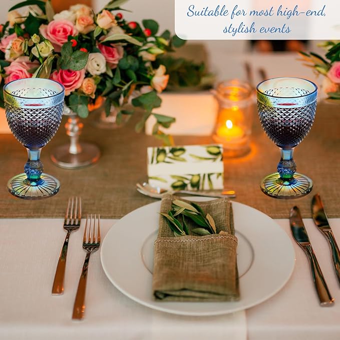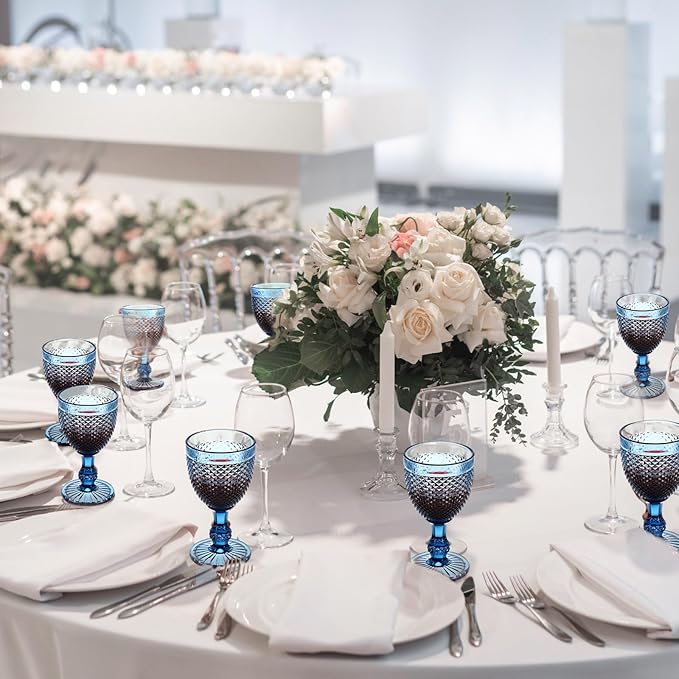 Bokon 12 Pack Blue Glass Goblets Set 10 oz High Clear Wine Glass Vintage Water Goblets Cups Embossed Diamond Design Glassware with Stem for Drinking Juice Liquor Party Wedding Bar
