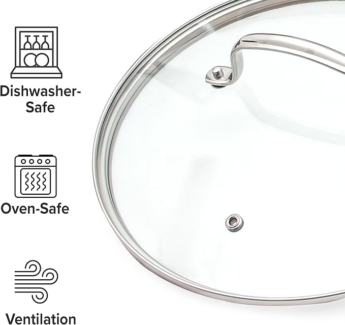 - PREMIUM TEMPERED GLASS LIDS – The premium shatter-resistant lids included with this set include a small ventilation opening to ensure steam is released safely while you’re cooking. Plus, they are oven safe up to 350°F and dishwasher safe.