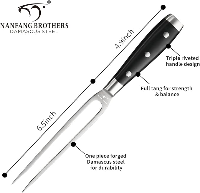 - 【UPGRADED 16-PIECE SET】 – This premium Damascus kitchen knife set includes 6 steak knives that glide through meat effortlessly, preserving the flavor and texture of your favorite cuts. Also included: a 6" meat fork, perfect for securely holding roasts during carving and serving. An ideal addition to any cooking or entertaining setup