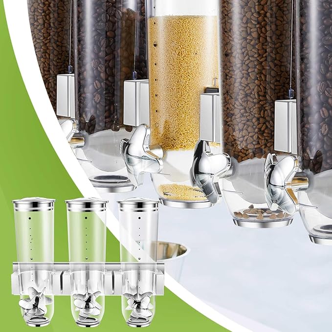 • Multiple Applications: this wall mounted dry food dispenser is helpful for storing and dispensing cereal, candy, nuts, coffee, beans, rice, grain, oatmeal, tea, snacks and more, avoiding messing up and keeping your kitchen neat