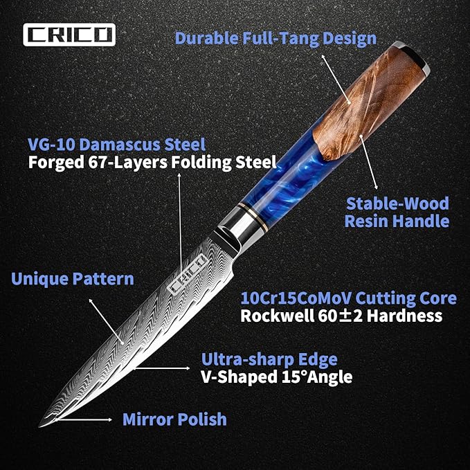 CRICO Paring Knife 5 inch, Kitchen Utility Knife, Fruit Paring Knives, VG10 Damascus Super Steel Forged 67-Layers, Full Tang Wood&Resin Handle, Gift Box - Flow Series