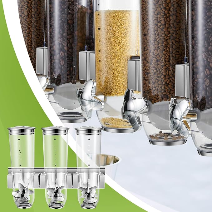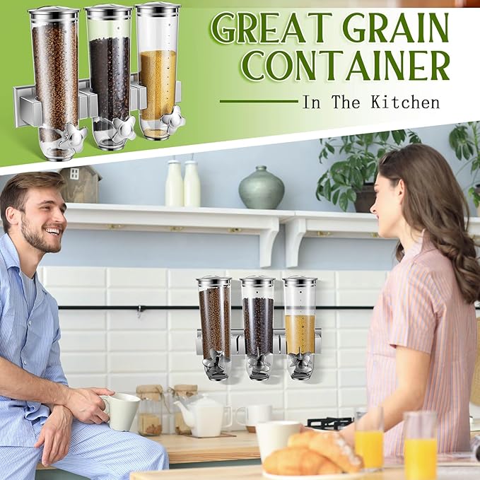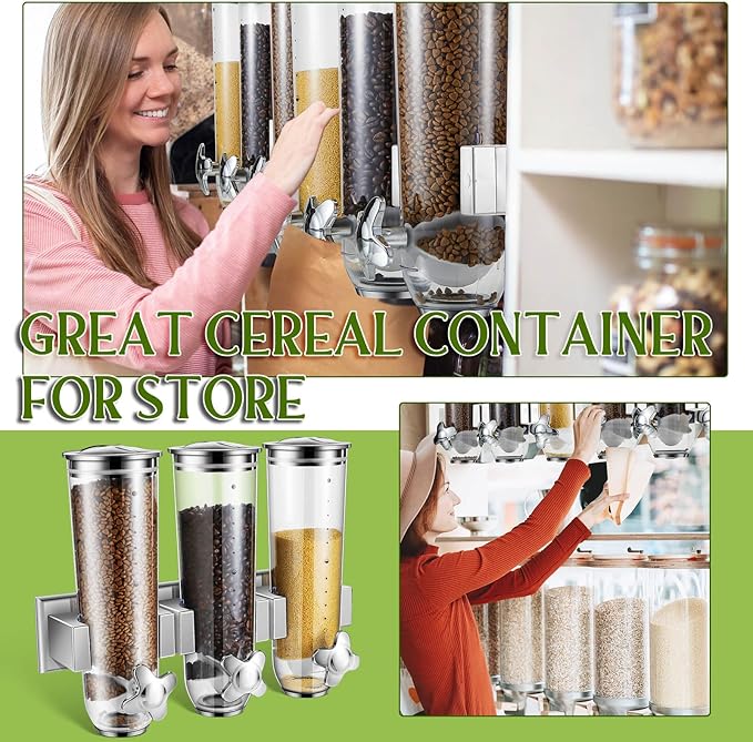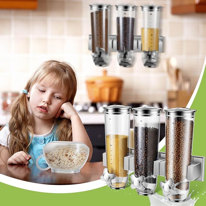 • Multiple Applications: this wall mounted dry food dispenser is helpful for storing and dispensing cereal, candy, nuts, coffee, beans, rice, grain, oatmeal, tea, snacks and more, avoiding messing up and keeping your kitchen neat