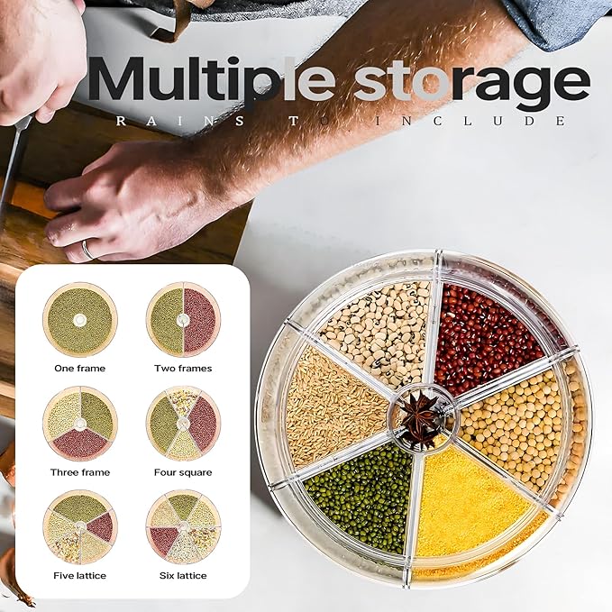 16lb Grain Dispenser 6 Grid Grain Container, 360° Rotating Dry Food Dispenser, Airtight Storage, Upgrade 6 Compartment Rotating Grain Dispenser Storage Container