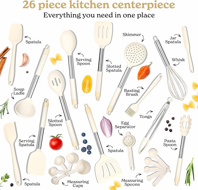 • Kitchen utensils: 26 sets of utensil sets includes, flexible spatula, soup spoon, serving spoon, pasta server, spatula turner, tongs, massage cup and spoon, 10 hooks, silicone mat, etc. Meet your various kitchen needs
