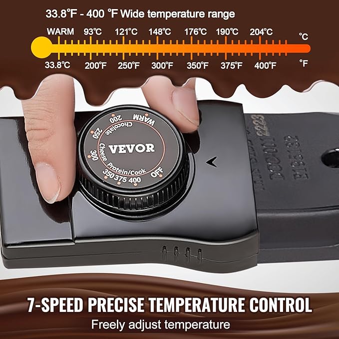 • Wide Temperature Range: You can manually adjust the temperature from 33.8℉ to 401℉ (approximately 70℃ to 205℃), making the chocolate melting warming fondue set easy to operate with precise temperature control.