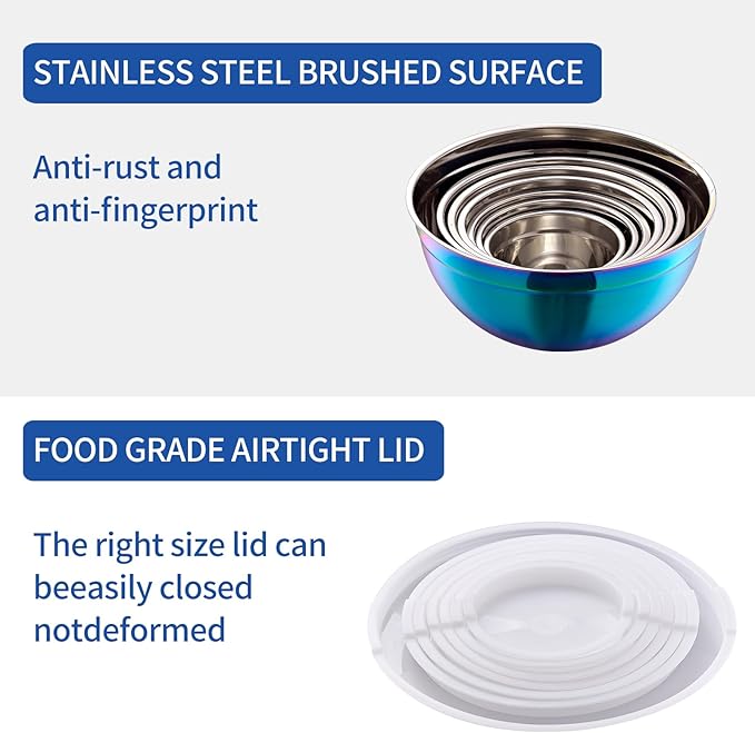 • 【 Sturdy, Durable & Deep Enough 】 - Onlycooker Multicolor Mixing Bowls are made of high quality stainless steel with a fine polished surface. Mixing bowls are ideal for all prep and storage work in the kitchen. Heat-resistant and rust-resistant. Thick and durable for daily use. It is deep enough to hold all the ingredients. And since the bowls are stainless steel, just give them a rinse and they don't hold the odor!