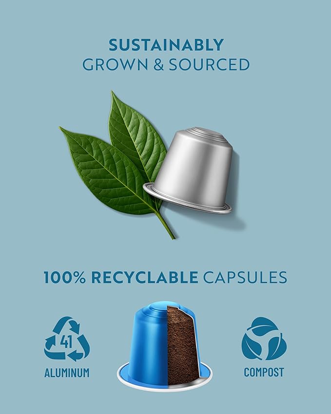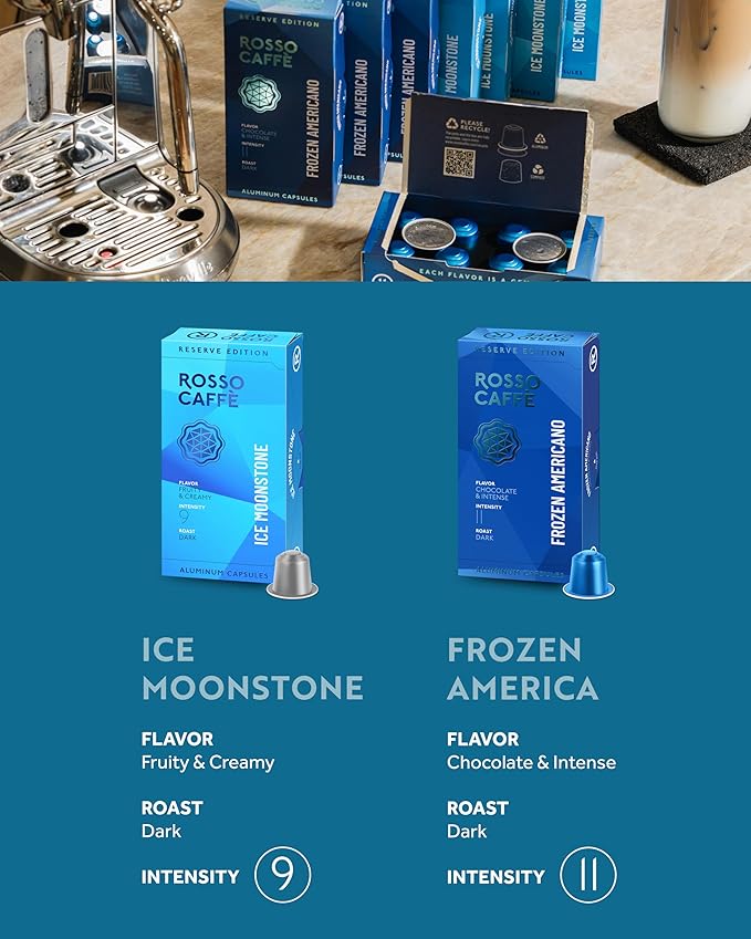 • Recyclable Aluminum Capsules - Sealed for Summer Freshness: Our Nespresso-compatible Ice pods are made from airtight, recyclable aluminum that locks in flavor and aroma. Brew cold, sip bold - and recycle easily for a cleaner planet and cooler summer.