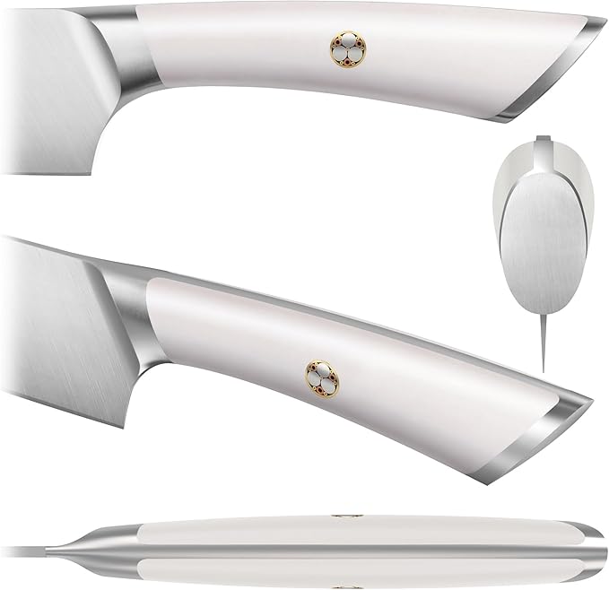 • Handcrafted full-tang knives forged from tight-grained X50CrMoV15 German Steel for incredible durability, stain resistance, and exceptional edge retention.
