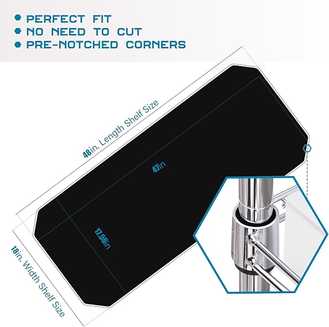 • 【Value Pack】Set of 5 shelf liners (17.28" x 47.03"), fits most brands of 18" X 48" wire shelf. The 4 corners with custom cutouts perfect fit with standard wire shelving system.