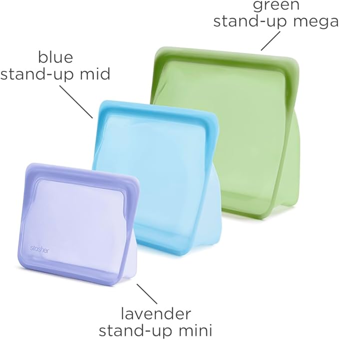 • CONTAINS: 3 Stasher Reusable Silicone Bags in the colors Lavender + Blue + Green. Includes 1 Stand-up Mini (28 Fl Oz), 1 Stand-up Mid (56 Fl Oz), and 1 Stand-up Mega (104 Fl Oz) Bag.
