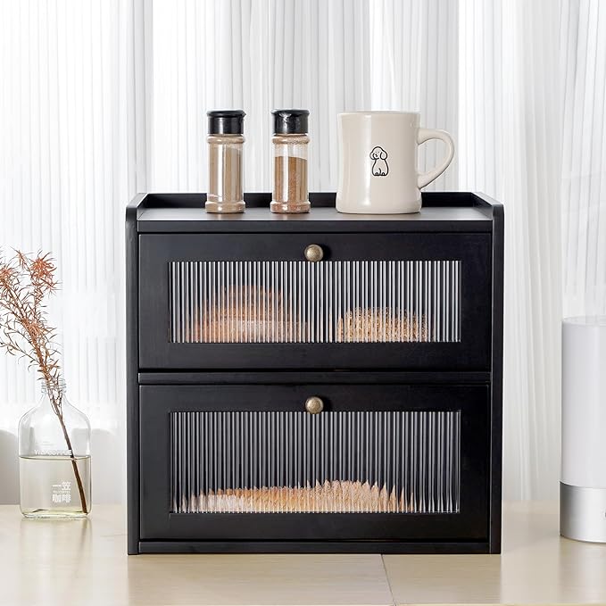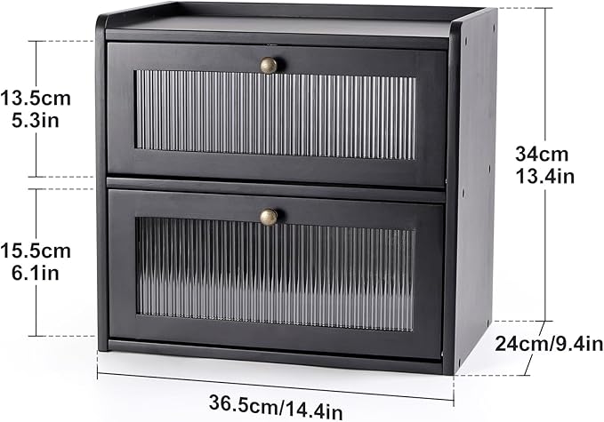 • 【Large Capacity】The bread box is large enough (L14.4in*W9.4in*H13.4in) for most personal and family use. The large exclusive space prevents bread from being squeezed, while the double-layered design makes your kitchen tidier without taking up too much counter space