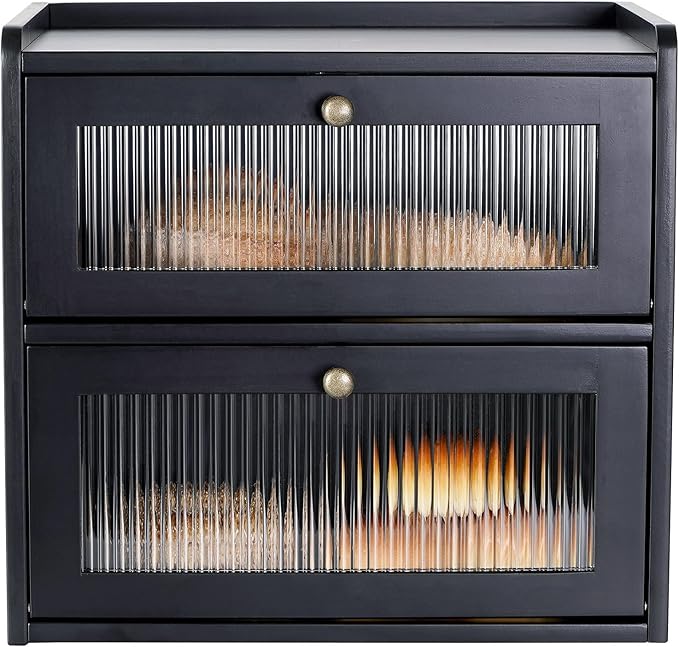 Sunhoo Bread Box for Kitchen Countertop Wooden Bread Storage Container Bin 2 Layer Breadbox Holder Large Capacity Keeper Vintage Farmhouse Food Organizer Pantry Shelf Acrylic Window(Black)