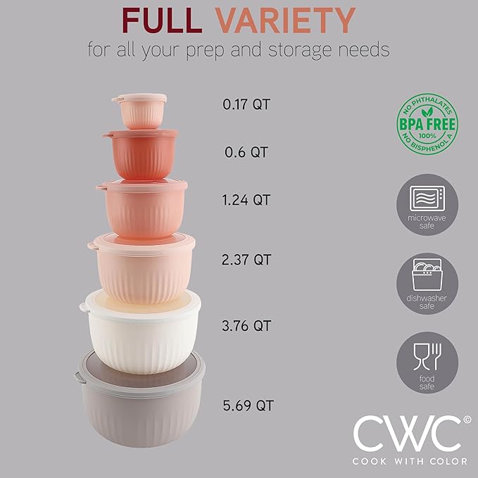 • Cook with Color 12 piece plastic mixing bowl set - non slip bowls with lids; easy to clean, sturdy mixing bowls.