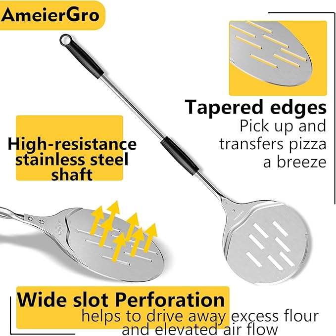 • AmeierGro 9-inch pizza turning peel, Crafted with precision, this turner peel blade is made of high-quality aluminum oxide, ensuring durability and longevity. Confidently slide your pizzas into your pizza oven, the perfect crust will be achieved.