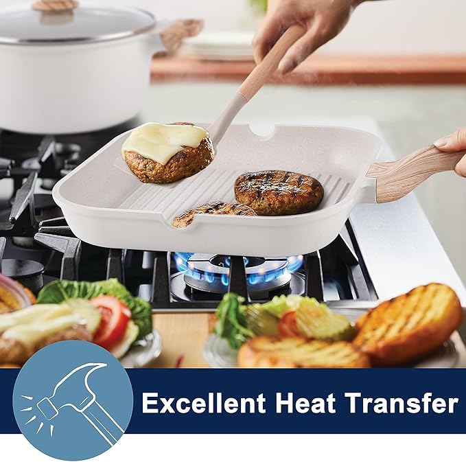 • Caannasweis Cookware Set: It comes fully equipped with a wide array of kitchen tools. Whether you're preparing simple daily meals or hosting a grand family gathering, this set can handle it all with ease. The meat cooked on the ridged edge of the griddle has unique grill marks, which are just like the feeling of a summer camping trip.